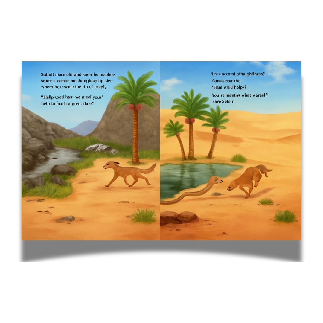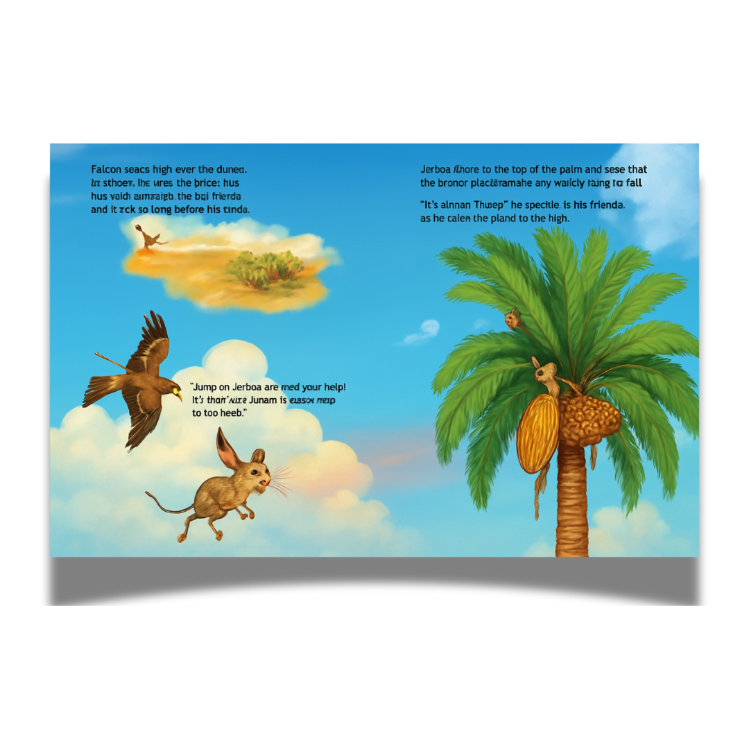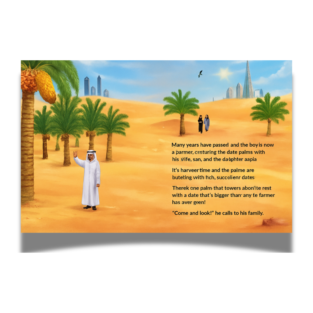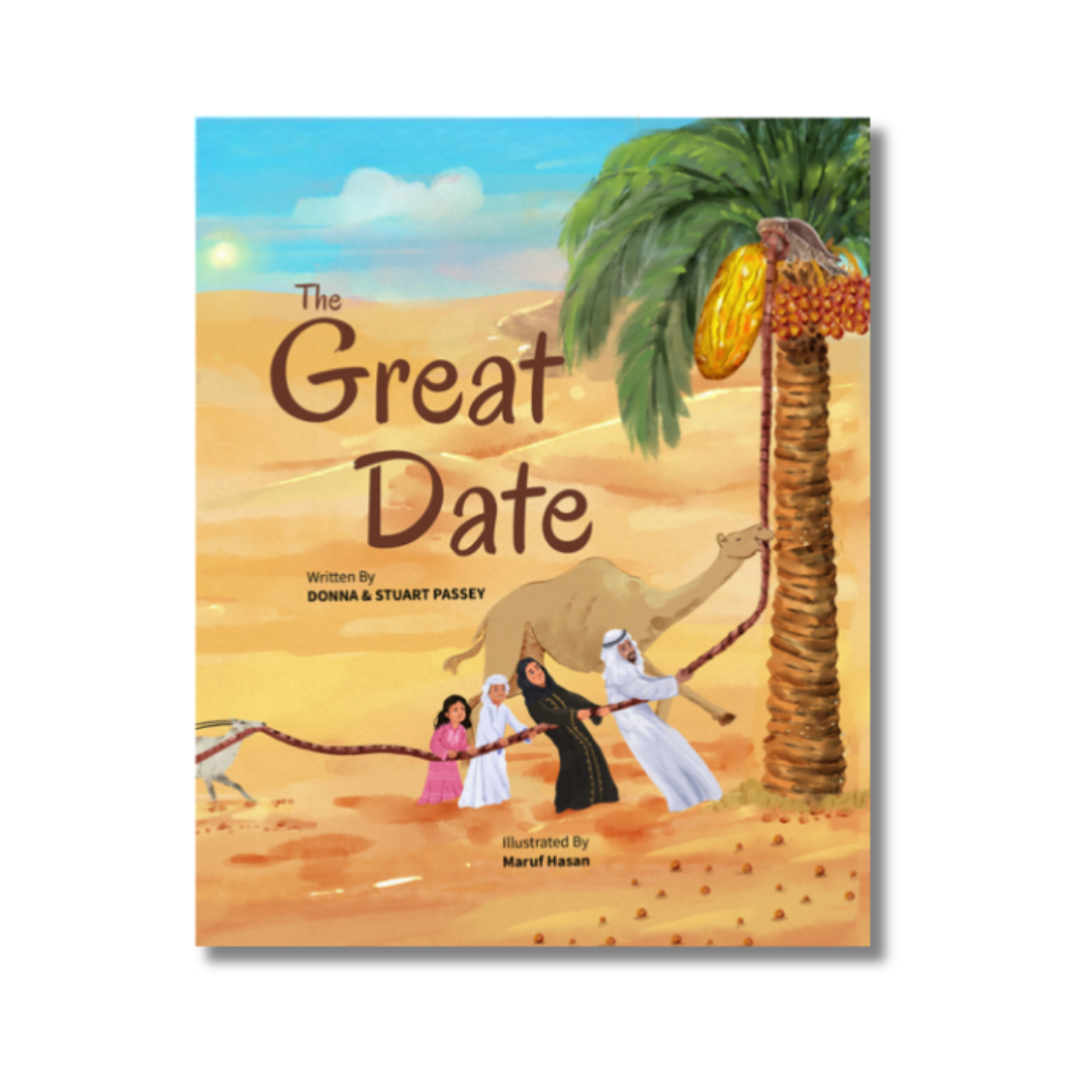 In the rolling dunes of a UAE date farm, something extraordinary is growing… …the biggest, juiciest date hanging from the tallest palm tree! How to get it down? A UAE family enlists a parade of desert friends, including a majestic falcon, a noble camel, a graceful oryx, a speedy saluki, a helpful desert hare, a slithery sand boa and a nimble jerboa. Can this unlikely team work together to get The Great Date? A heartwarming and humorous retelling of a beloved folk tale, The Great Date celebrates family, community, teamwork, and the magic of the desert.